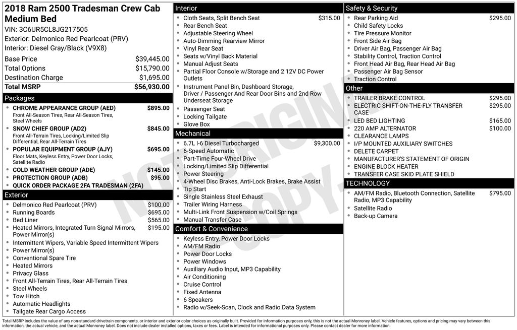 Anti-Spin Differential Rear Axle, Bright Front Bumper, Bright Grille, Bright Rear Bumper, Chrome Appearance Group, Clearance Lamps, I/P Mounted Auxiliary Switches, Protection Group, Quick Order Package 2FA Tradesman, Snow Chief Group, Wheels: 18" x 8.0" Steel Chrome Clad.