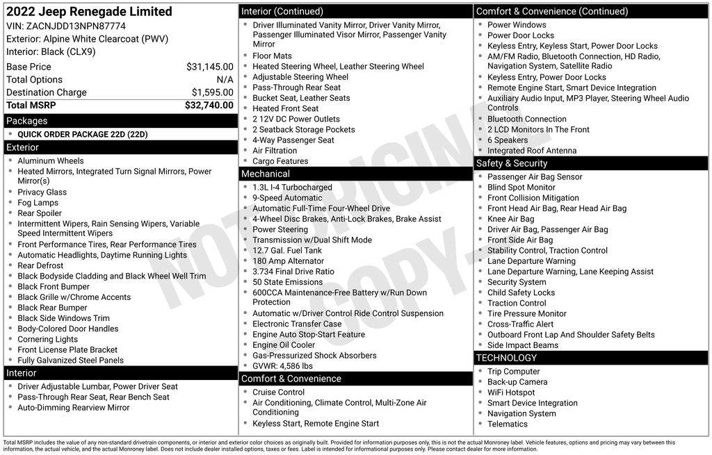2022 Alpine White Clearcoat Jeep Renegade Limited 4WD 9-Speed 948TE Automatic 23/29 City/Highway MPG 1.3L I4