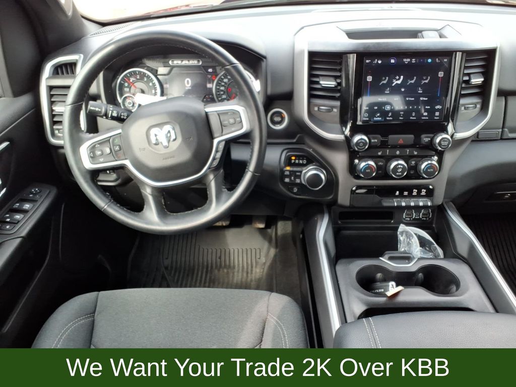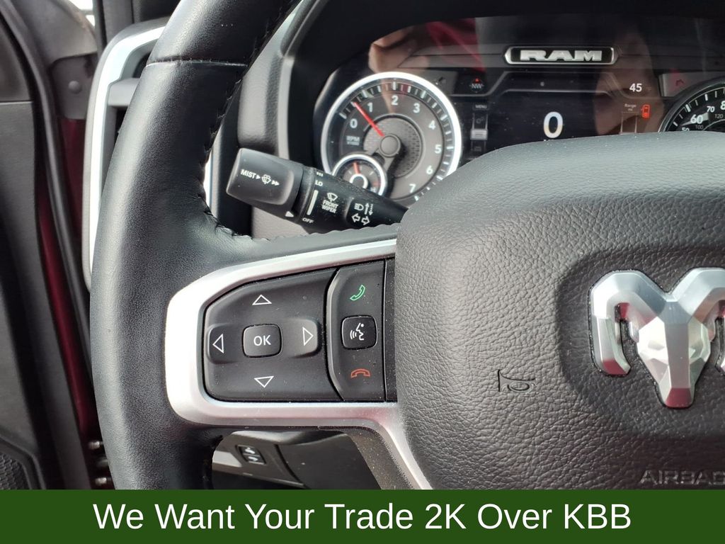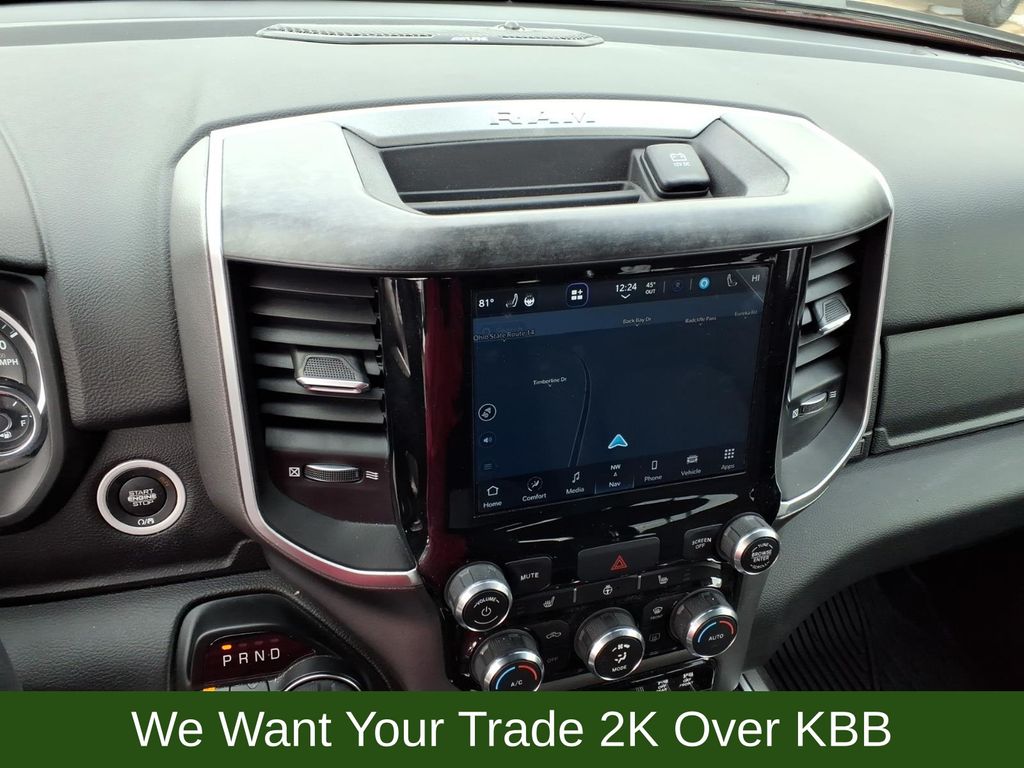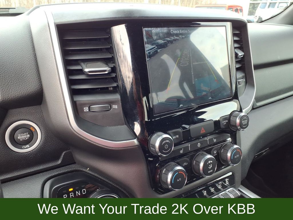 115V Auxiliary Power Outlet, 115V Auxiliary Rear Power Outlet, 2nd Row In Floor Storage Bins, 3 Rear Seat Head Restraints, 3.21 Rear Axle Ratio, 4 Way Front Headrests, 4-Wheel Disc Brakes, 400W Inverter, 48V Belt Starter Generator, 4G LTE Wi-Fi Hot Spot, 6 Speakers, 8.4" Touchscreen Display, 9 Amplified Speakers w/Subwoofer, ABS brakes, Air Conditioning, Air Conditioning ATC w/Dual Zone Control, All Plant-Installed Decals, All R1 High Radios, All Radio Equipped Vehicles, Alloy wheels, AM/FM radio, Apple CarPlay, Auto-Dimming Exterior Driver Mirror, Auto-Dimming Rear-View Mirror, Big Horn Badge, Big Horn Level 2 Equipment Group, Black Exterior Mirrors, Black Interior Accents, Black Premium Power Mirrors, Bluetooth Handsfree Phone & Audio, Body Color Exterior Mirrors, Body Color Front Bumper, Body Color Premium Power Mirrors, Body Color Rear Bumper w/Step Pads, Brake assist, Bridgestone Brand Tires, Bucket Seats, Bumpers: chrome, Class IV Receiver Hitch, Cloth Bench Seat, Cluster 7.0" TFT Color Display, Compass, Connected Travel & Traffic Services, Connectivity - US/Canada, Convex Wide-Angle Mirror Insert, Delay-off headlights, Delete LED Lamp - Floor Console Bin, Deluxe Cloth Bucket Seats, Disassociated Touchscreen Display, Driver door bin, Dual front impact airbags, Dual front side impact airbags, Electronic Stability Control, Emergency communication system: SiriusXM Guardian, Exterior Mirrors Courtesy Lamps, Exterior Mirrors w/Heating Element, Exterior Mirrors w/Supplemental Signals, For Details, Visit DriveUconnect.com, Front anti-roll bar, Front Center Armrest w/Storage, Front fog lights, Front reading lights, Front Seat Back Map Pockets, Front wheel independent suspension, Full Length Floor Console, Fully automatic headlights, Global Telematics Box Module (TBM), Glove Box Lamp, Google Android Auto, GPS Antenna Input, GPS Navigation, HD Radio, Heated door mirrors, Heated Front Seats, Heated Steering Wheel, Heavy-Duty Engine Cooling, Illuminated entry, Integrated Center Stack Radio, Integrated Voice Command w/Bluetooth, Leather steering wheel, Low tire pressure warning, Manual Adjust 4-Way Front Passenger Seat, Media Hub w/2 Charge Only USBs, MOPAR Front & Rear Rubber Floor Mats, Occupant sensing airbag, Outside temperature display, Overhead airbag, Overhead console, Panic alarm, ParkSense Front/Rear Park Assist w/Stop, ParkView Rear Back-Up Camera, Passenger door bin, Passenger vanity mirror, Power 2-Way Driver Lumbar Adjust, Power 8-Way Driver Seat, Power Adjustable Pedals, Power door mirrors, Power steering, Power windows, Power-Folding Mirrors, Quick Order Package 27Z Big Horn, Radio data system, Radio: Uconnect 3 w/5" Display, Radio: Uconnect 5 Nav w/8.4" Display, Radio: Uconnect 5 W w/8.4" Display, Rear 60/40 Folding Seat, Rear anti-roll bar, Rear Center Armrest, Rear Dome w/On/Off Switch Lamp, Rear Power Sliding Window, Rear seat center armrest, Rear step bumper, Rear Underseat Compartment Storage (DISC), Rear Window Defroster, Remote keyless entry, Remote Start System, Security Alarm, SiriusXM Radio Service, SiriusXM Satellite Radio, SiriusXM w/360L, Speed control, Split folding rear seat, Sport Appearance Package, Sport Decal, Steering wheel mounted audio controls, Sun Visors w/Illuminated Vanity Mirrors, Tachometer, Telescoping steering wheel, Tilt steering wheel, Traction control, Trip computer, Universal Garage Door Opener, USB Host Flip, Variably intermittent wipers, Voltmeter, Wheels: 18" x 8" Cast-Aluminum Painted, Wheels: 20" x 9" Aluminum Chrome Clad (WRK).