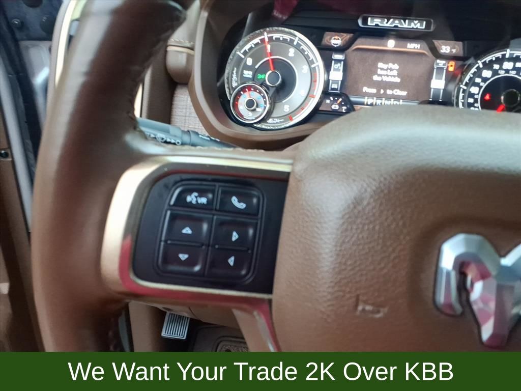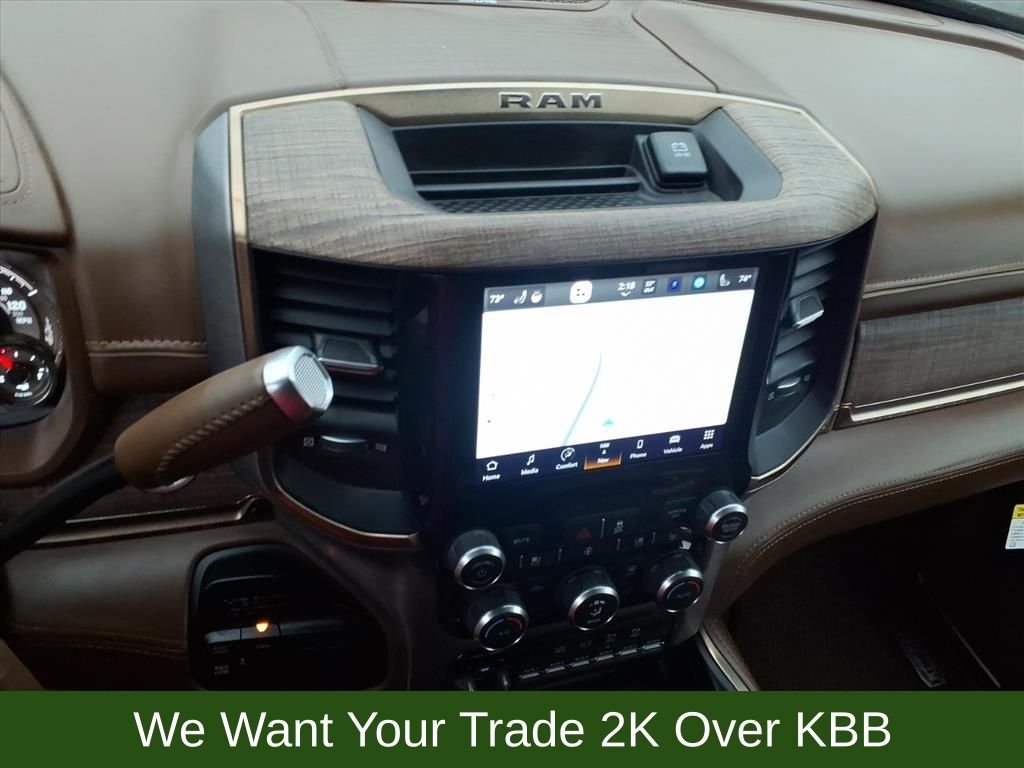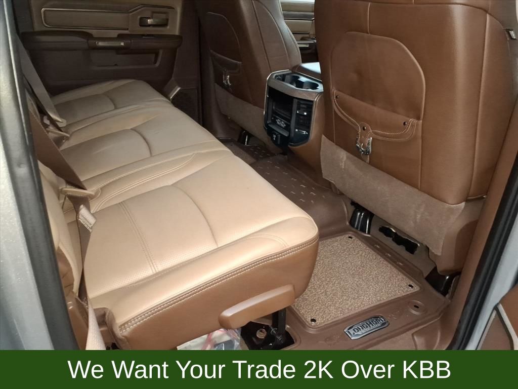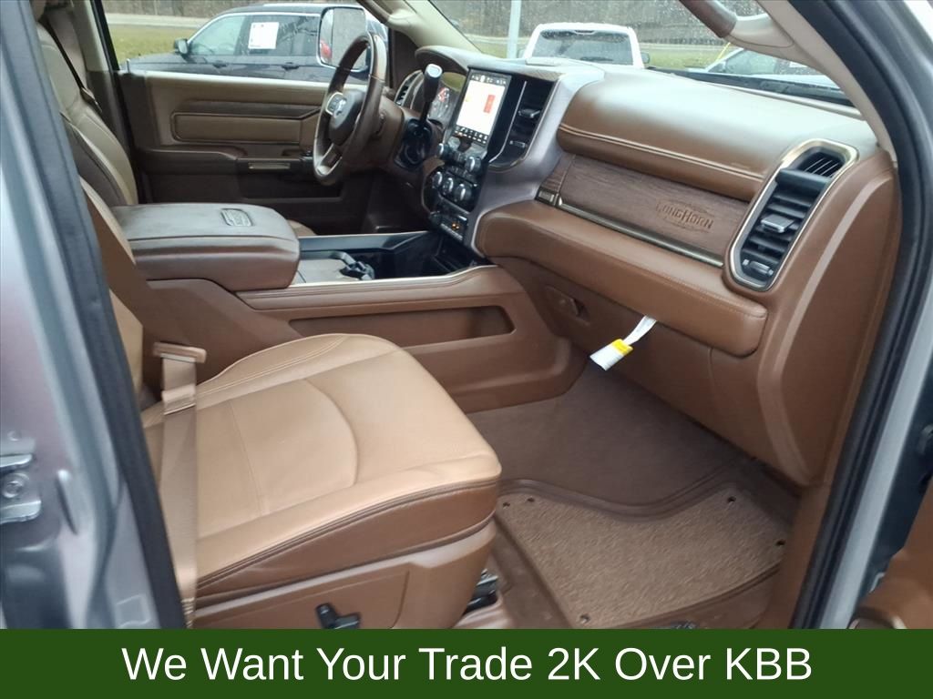 10 Speakers, 115V Auxiliary Rear Power Outlet, 2 Way Rear Headrest Seat, 220 Amp Alternator, 3.73 Axle Ratio, 4 Way Front Headrests, 4-Wheel Disc Brakes, 4G LTE Wi-Fi Hot Spot, 8.4" Touchscreen Display, ABS brakes, Active Noise Control System, Adjustable pedals, Air Conditioning, Alexa Built-In, Alloy wheels, AM/FM radio: SiriusXM with 360L, Anti-Spin Differential Rear Axle, Apple CarPlay, Apple CarPlay/Android Auto, Audio memory, Auto High-beam Headlights, Auto-dimming Rear-View mirror, Automatic temperature control, Brake assist, Bucket Seats, Bumpers: chrome, Center Hub, Chrome Flat Wheel-to-Wheel Side Steps, Clearance Lamps, Compass, Connected Travel & Traffic Services, Connectivity - US/Canada, Dash Pass Thru Wire Circuits, Delay-off headlights, Disassociated Touchscreen Display, Driver door bin, Driver vanity mirror, Dual front impact airbags, Dual front side impact airbags, Electronic Stability Control, Electronically Controlled Throttle, Engine Block Heater, Front anti-roll bar, Front Bucket Seats, Front Center Armrest w/Storage, Front dual zone A/C, Front fog lights, Front reading lights, Front Seat Back Map Pockets, Full Length Premium Upgraded Floor Console, Fully automatic headlights, Garage door transmitter, Genuine wood console insert, Genuine wood dashboard insert, Genuine wood door panel insert, Global Telematics Box Module (TBM), Google Android Auto, GPS Antenna Input, GPS Navigation, HD Radio, Heated door mirrors, Heated Front Seats, Heated front seats, Heated rear seats, Heated Second Row Seats, Heated Steering Wheel, Heated steering wheel, High Back Seats, I/P Mounted Auxiliary Switches, Illuminated entry, Integrated Center Stack Radio, Integrated Voice Command w/Bluetooth, Leather steering wheel, Low tire pressure warning, Memory seat, Navigation System, Occupant sensing airbag, Off-Road Information Pages, Outside temperature display, Overhead airbag, Overhead console, Panic alarm, ParkView Rear Back-Up Camera, Passenger door bin, Passenger vanity mirror, Pedal memory, Power 2-Way Driver Lumbar Adjust, Power 2-Way Passenger Lumbar Adjust, Power Adjust 8-Way Driver Seat, Power Adjust 8-Way Front Passenger Seat, Power door mirrors, Power driver seat, Power passenger seat, Power steering, Power windows, Premium Filigree Leather Seats, Quick Order Package 2HK Longhorn, Radio data system, Radio: Uconnect 5 Nav w/8.4" Display, Radio/Driver Seat/Mirrors/Pedals Memory, Rain sensing wipers, Rear 60/40 Folding Seat, Rear anti-roll bar, Rear reading lights, Rear seat center armrest, Rear step bumper, Rear window defroster, Remote keyless entry, Security system, Selectable Tire Fill Alert, SiriusXM Radio Service, SiriusXM w/360L, Snow Chief Group, Speed control, Split folding rear seat, Steering wheel mounted audio controls, Tachometer, Tilt steering wheel, Tip Start, Traction control, Trip computer, Turn signal indicator mirrors, Variably intermittent wipers, Vendor Painted Cargo Box, Vendor Painted Cargo Box Tracking, Ventilated Front Seats, Ventilated front seats, Voltmeter, Wheels: 18" x 8.0" Diamond Cut Face Aluminum, Wheels: 18" x 8.0" Polished Aluminum.