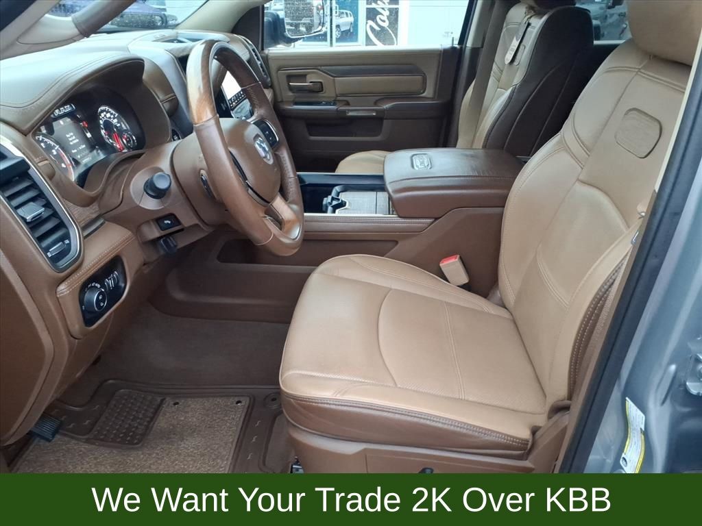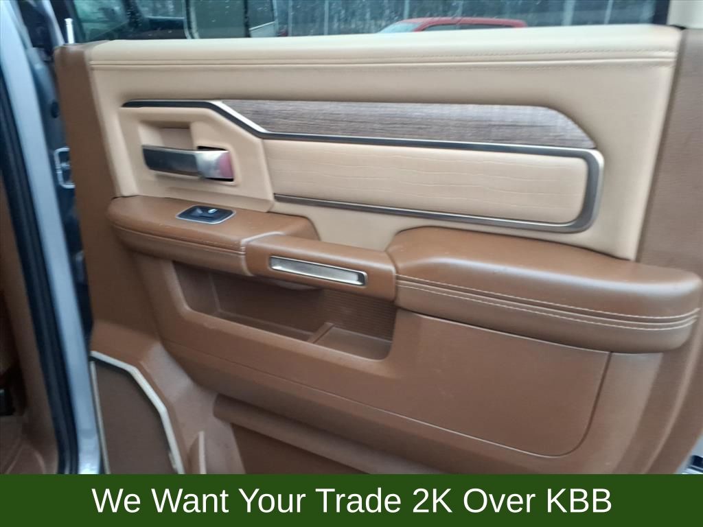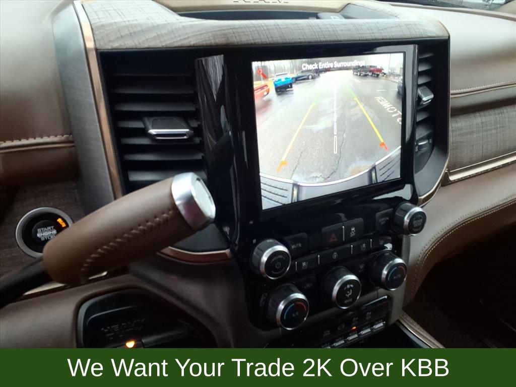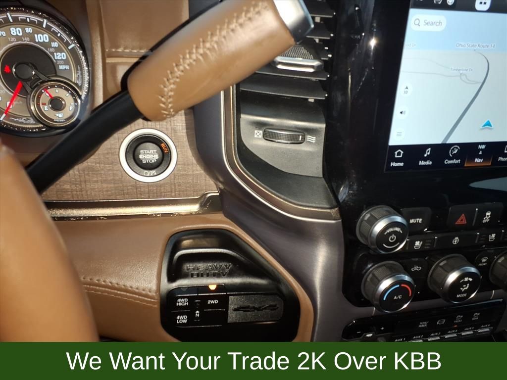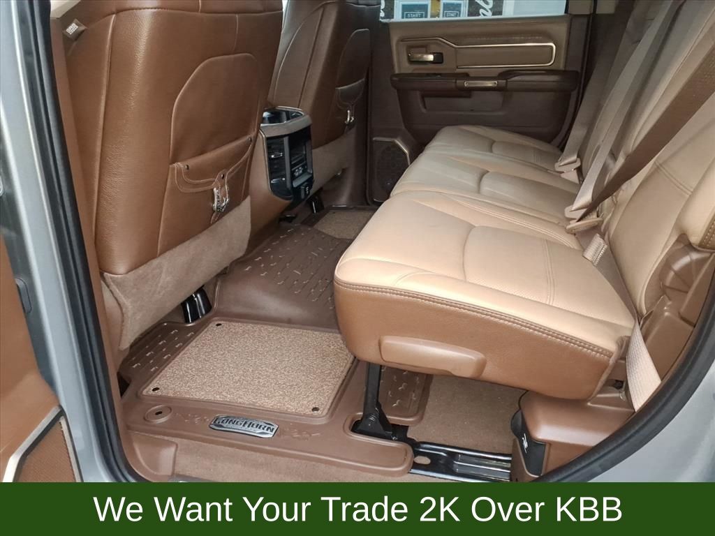 10 Speakers, 115V Auxiliary Rear Power Outlet, 2 Way Rear Headrest Seat, 220 Amp Alternator, 3.73 Axle Ratio, 4 Way Front Headrests, 4-Wheel Disc Brakes, 4G LTE Wi-Fi Hot Spot, 8.4" Touchscreen Display, ABS brakes, Active Noise Control System, Adjustable pedals, Air Conditioning, Alexa Built-In, Alloy wheels, AM/FM radio: SiriusXM with 360L, Anti-Spin Differential Rear Axle, Apple CarPlay, Apple CarPlay/Android Auto, Audio memory, Auto High-beam Headlights, Auto-dimming Rear-View mirror, Automatic temperature control, Brake assist, Bucket Seats, Bumpers: chrome, Center Hub, Chrome Flat Wheel-to-Wheel Side Steps, Clearance Lamps, Compass, Connected Travel & Traffic Services, Connectivity - US/Canada, Dash Pass Thru Wire Circuits, Delay-off headlights, Disassociated Touchscreen Display, Driver door bin, Driver vanity mirror, Dual front impact airbags, Dual front side impact airbags, Electronic Stability Control, Electronically Controlled Throttle, Engine Block Heater, Front anti-roll bar, Front Bucket Seats, Front Center Armrest w/Storage, Front dual zone A/C, Front fog lights, Front reading lights, Front Seat Back Map Pockets, Full Length Premium Upgraded Floor Console, Fully automatic headlights, Garage door transmitter, Genuine wood console insert, Genuine wood dashboard insert, Genuine wood door panel insert, Global Telematics Box Module (TBM), Google Android Auto, GPS Antenna Input, GPS Navigation, HD Radio, Heated door mirrors, Heated Front Seats, Heated front seats, Heated rear seats, Heated Second Row Seats, Heated Steering Wheel, Heated steering wheel, High Back Seats, I/P Mounted Auxiliary Switches, Illuminated entry, Integrated Center Stack Radio, Integrated Voice Command w/Bluetooth, Leather steering wheel, Low tire pressure warning, Memory seat, Navigation System, Occupant sensing airbag, Off-Road Information Pages, Outside temperature display, Overhead airbag, Overhead console, Panic alarm, ParkView Rear Back-Up Camera, Passenger door bin, Passenger vanity mirror, Pedal memory, Power 2-Way Driver Lumbar Adjust, Power 2-Way Passenger Lumbar Adjust, Power Adjust 8-Way Driver Seat, Power Adjust 8-Way Front Passenger Seat, Power door mirrors, Power driver seat, Power passenger seat, Power steering, Power windows, Premium Filigree Leather Seats, Quick Order Package 2HK Longhorn, Radio data system, Radio: Uconnect 5 Nav w/8.4" Display, Radio/Driver Seat/Mirrors/Pedals Memory, Rain sensing wipers, Rear 60/40 Folding Seat, Rear anti-roll bar, Rear reading lights, Rear seat center armrest, Rear step bumper, Rear window defroster, Remote keyless entry, Security system, Selectable Tire Fill Alert, SiriusXM Radio Service, SiriusXM w/360L, Snow Chief Group, Speed control, Split folding rear seat, Steering wheel mounted audio controls, Tachometer, Tilt steering wheel, Tip Start, Traction control, Trip computer, Turn signal indicator mirrors, Variably intermittent wipers, Vendor Painted Cargo Box, Vendor Painted Cargo Box Tracking, Ventilated Front Seats, Ventilated front seats, Voltmeter, Wheels: 18" x 8.0" Diamond Cut Face Aluminum, Wheels: 18" x 8.0" Polished Aluminum.