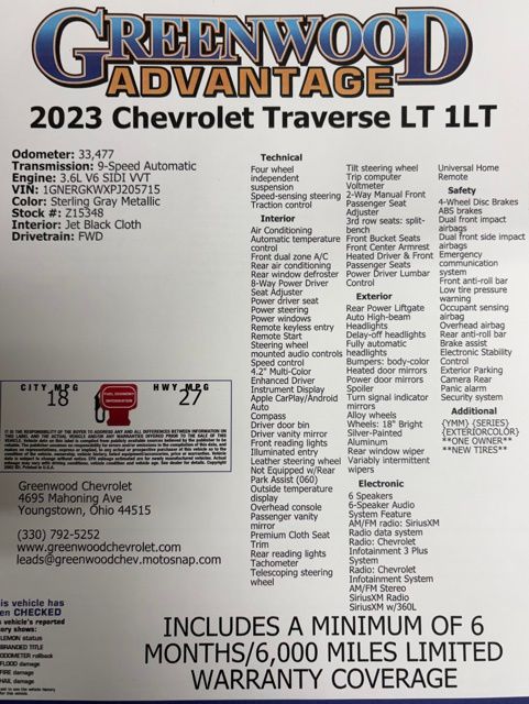 Sterling Gray Metallic 2023 Chevrolet Traverse LT 1LT 1LT FWD 9-Speed Automatic 3.6L V6 SIDI VVT **ONE OWNER**, **NEW TIRES**, 4-Wheel Disc Brakes, 4.2" Multi-Color Enhanced Driver Instrument Display, 8-Way Power Driver Seat Adjuster, Apple CarPlay/Android Auto, Automatic temperature control, Convenience & Driver Confidence Package, Exterior Parking Camera Rear, Heated Driver & Front Passenger Seats, Leather steering wheel, Radio: Chevrolet Infotainment 3 Plus System, Rear Power Liftgate, Remote Start, SiriusXM w/360L, Telescoping steering wheel, Universal Home Remote, Wheels: 18" Bright Silver-Painted Aluminum.
