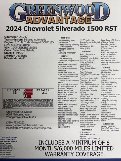 Slate Gray Metallic 2024 Chevrolet Silverado 1500 RST 4WD 8-Speed Automatic 2.7L I4 Turbocharged DOHC 16V LEV3-SULEV30 310hp **CLEAN CARFAX**, 8-Speed Automatic, 4WD, Jet Black Cloth, 10-Way Power Driver Seat w/Lumbar, 12.3" Multicolor Reconfigurable Digital Display, 120-Volt Bed Mounted Power Outlet, 120-Volt Interior Power Outlet, 6-Speaker Audio System, All-Star Edition, Auto-Locking Rear Differential, Black Name Plates (LPO), Bluetooth® For Phone, Chevrolet Connected Access Capable, Color-Keyed Carpeting Floor Covering, Convenience Package, Dark Essentials Package (LPO), Deep-Tinted Glass, Dual Rear USB Ports (Charge Only), Dual-Zone Automatic Climate Control, Electric Rear-Window Defogger, Electrical Steering Column Lock, Electronic Cruise Control, EZ Lift Power Lock & Release Tailgate, Front Frame-Mounted Black Recovery Hooks, Front LED Fog Lamps, Front Rubberized Vinyl Floor Mats, HD Rear Vision Camera, Heated Driver & Front Outboard Passenger Seats, Heated Power-Adjustable Outside Mirrors, Heated Steering Wheel, High Capacity Suspension Package, High Gloss Black Mirror Caps, Hitch Guidance, Inside Rear-View Mirror w/Tilt, Keyless Open & Start, LED Cargo Area Lighting, OnStar & Chevrolet Connected Services Capable, Power Front Windows w/Driver Express Up/Down, Power Front Windows w/Passenger Express Down, Power Rear Windows w/Express Down, Preferred Equipment Group 1SP, Rear 60/40 Folding Bench Seat (Folds Up), Rear Rubberized-Vinyl Floor Mats, Remote Vehicle Starter System, SiriusXM w/360L, Standard Tailgate, Steering Wheel Audio Controls, Theft Deterrent System (Unauthorized Entry), Trailering Package, Wheels: 20" x 9" High Gloss Black Painted Alum, Wi-Fi Hot Spot Capable, Wrapped Steering Wheel.