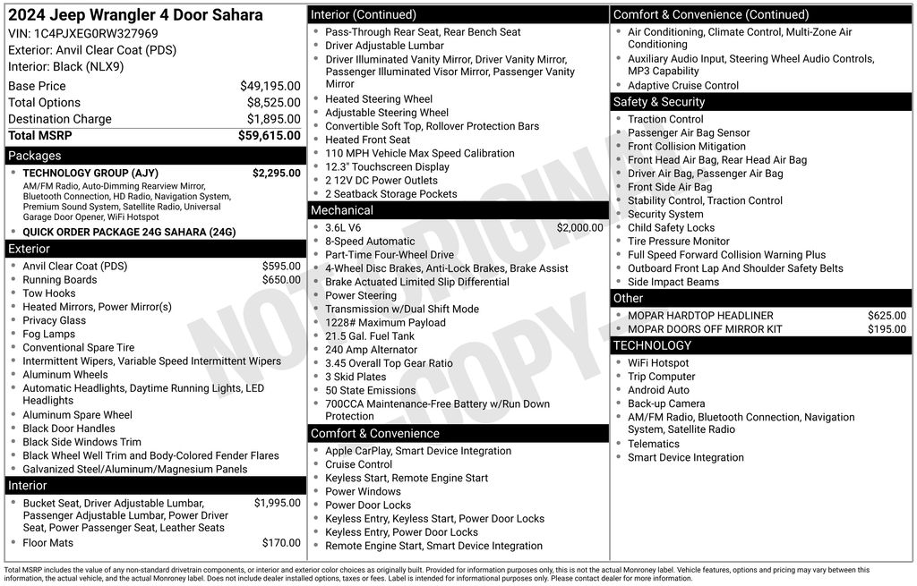 • MOPAR ACCESSORIES: Elevate your style and functionality with the MOPAR chrome tube steps, doors-off mirror kit, hardtop headliner, and all-weather floor mats.
