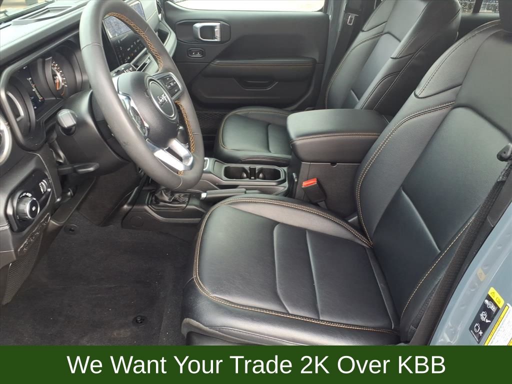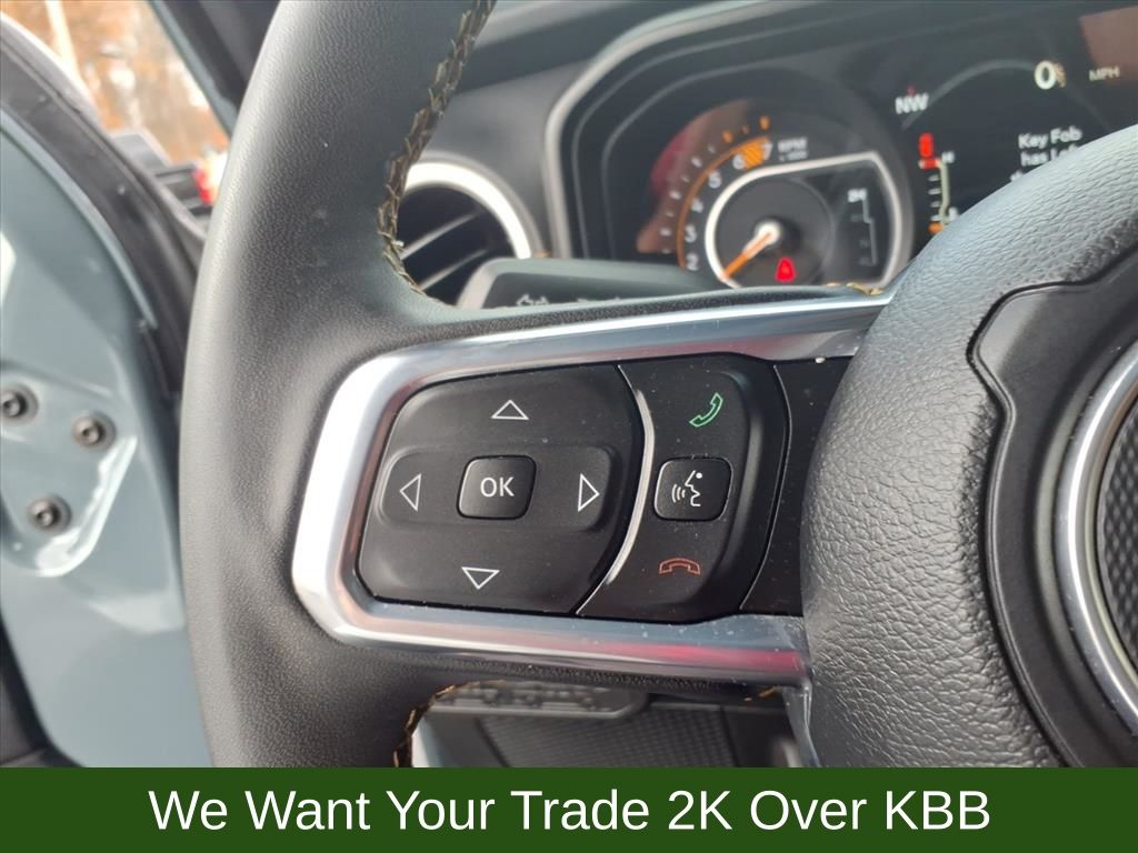This Wrangler Sahara also offers a wealth of premium amenities, such as Apple CarPlay, Android Auto, auto-dimming rearview mirror, universal garage door opener, and more. The sleek gray exterior complements the luxurious black McKinley-trimmed seats, providing a striking and sophisticated look both inside and out.